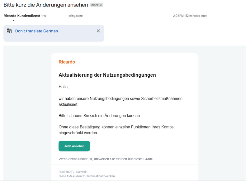 Derzeit werden vermehrt betrügerische E-Mails im Namen von Ricardo versendet. Sie stammen von gefälschten Absenderadressen und enthalten Links zu nicht von Ricardo erstellten Seiten.