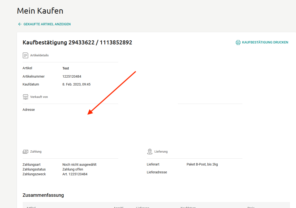 Du findest diese Informationen auch direkt nach Angebotsende in deinem Benutzerkonto unter "Mein Kaufen" > "Gekauft" - beim entsprechenden Angebot unter "Details" (kleiner Pfeil) unter "Kaufbestätigung ansehen".