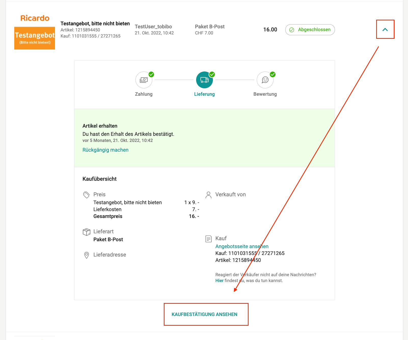 Nach Angebotsende bekommst du als Käufer eine E-Mail von Ricardo mit der Bestätigung deines erfolgreichen Kaufes.